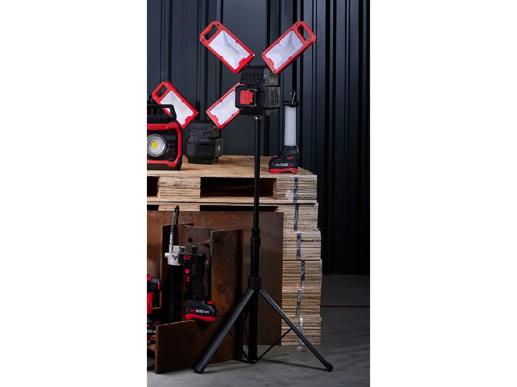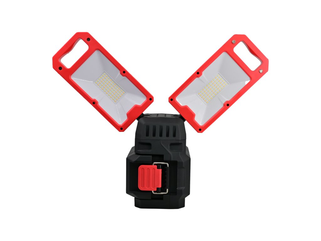 Robustní a výkonné světlo pro profesionální použití v dílně, garáži i na stavbě. Dva výklopné panely s SMD LED diodami (teplé a studené světlo) umožňují polohování v rozsahu 180° a 360°, takže si nasvítíte přesně tam, kde potřebujete. Světelný výkon dosahuje až 7000 lumenů, což je extrémní hodnota pro AKU světla.