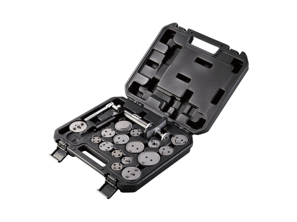 Součástí sady je lis na brzdové válečky a 16 kusů kotoučů s různými rozměry pro běžné značky a modely automobilů na trhu.