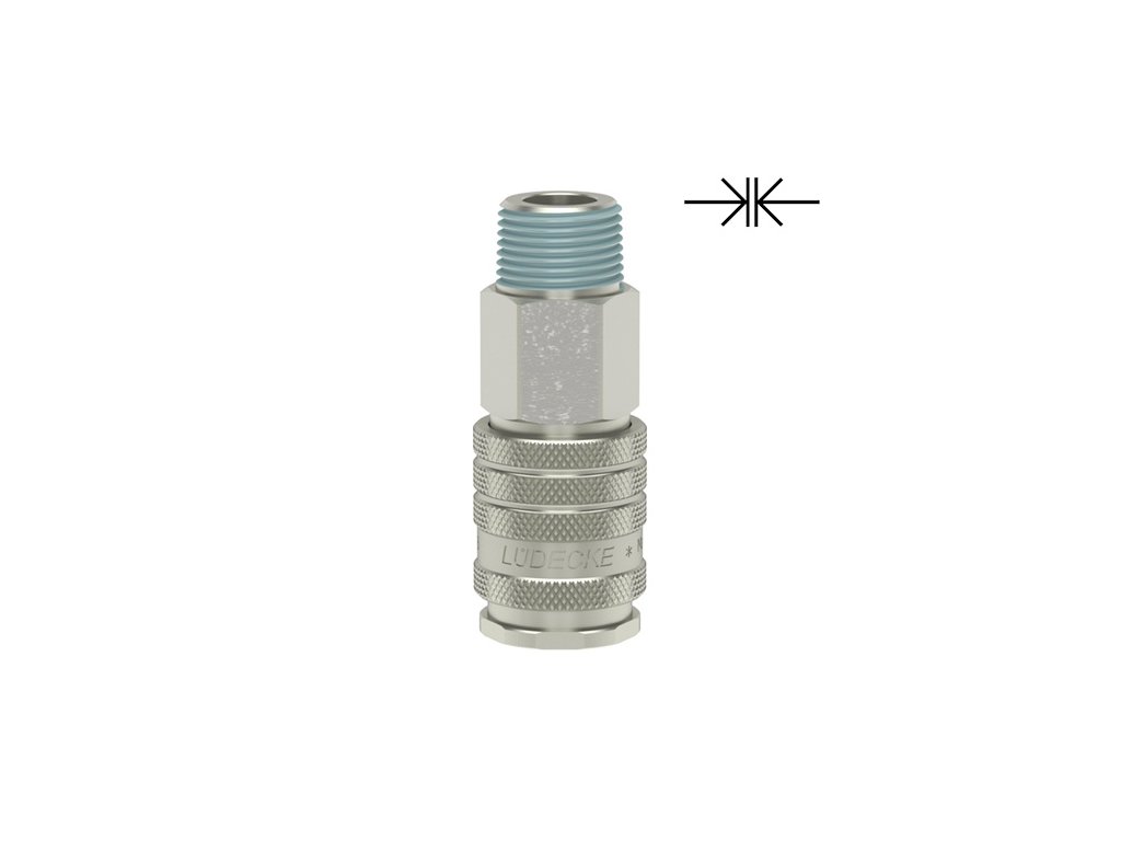 Průmyslové rychlospojky Lüdecke DN7,8 s vnějším kuželovým závitem. Robustní provedení s optimálním utěsněním, ve volně průchozím provedení, určené zejména pro stlačený vzduch v průmyslu a řemeslnictví. Vhodné pro pneumatické nářadí s vysokou spotřebou stlačeného vzduch. Provedení z mosazi MS 58 s prvky z niklované tvrzené oceli, nerezové oceli a NBR.