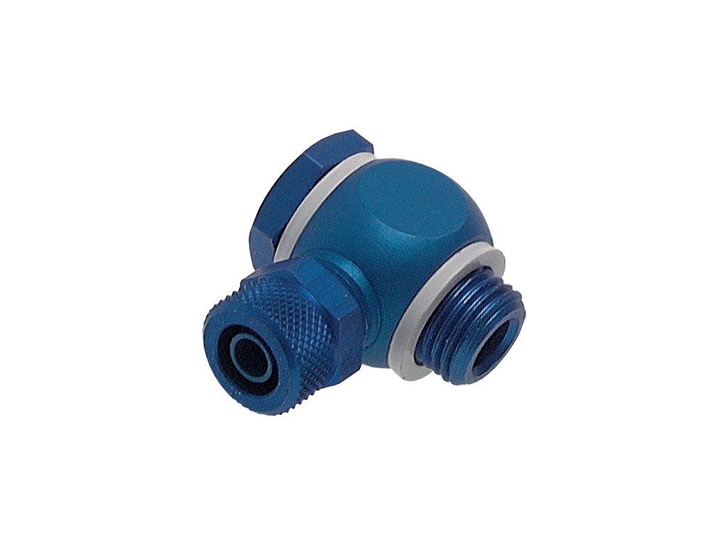Otočné úhlové šroubení s převlečnou maticí ve tvaru L s vnějším trubkovým závitem, pro rychlou a jednoduchou montáž plastových hadiček 8/6mm.