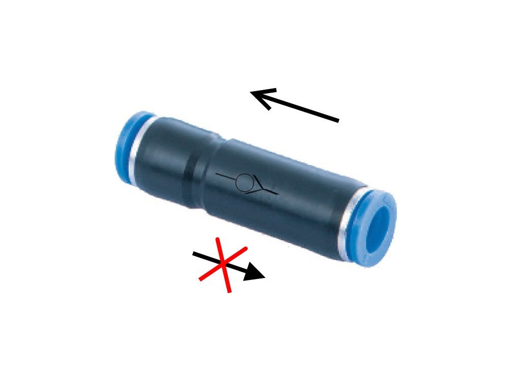 Zpětný ventil s mosazným tělem pro rychlou a jednoduchou montáž plastových hadiček s vnějším průměrem 12 mm. Průchod vzduchu pouze jedním směrem.