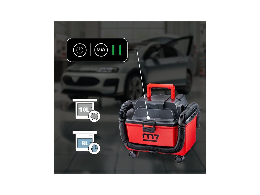 Vysavač DDWV-104 od Mighty Seven je kompaktní, ale extrémně výkonný pomocník pro úklid v dílně, garáži i domácnosti. Nabízí dvě úrovně výkonu – 100 W / 9 kPa pro úsporný režim a 200 W / 16 kPa pro maximální sací sílu, která si poradí i s náročnými nečistotami. Vysavač je vhodný pro suché i mokré vysávání, s objemnou nádobou 10 litrů pro prach a 8 litrů pro vodu.